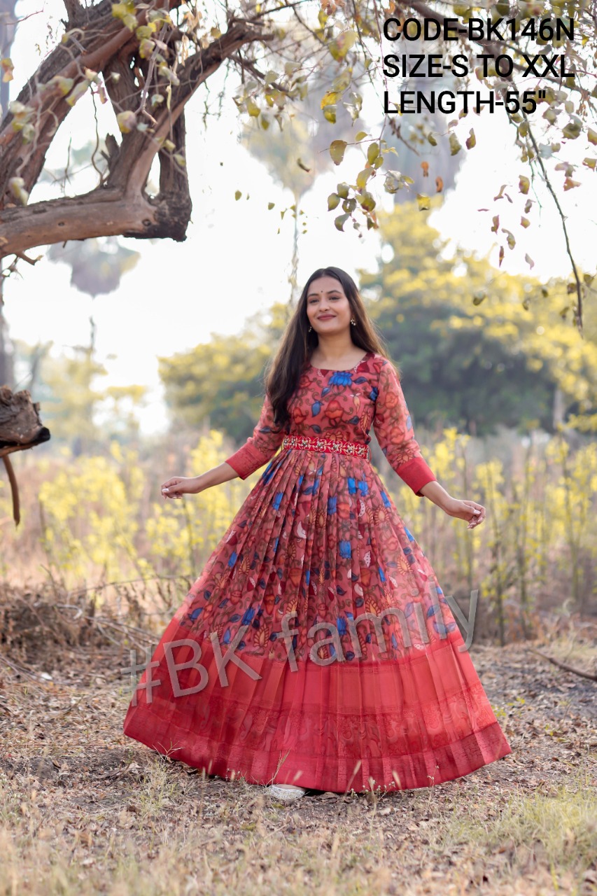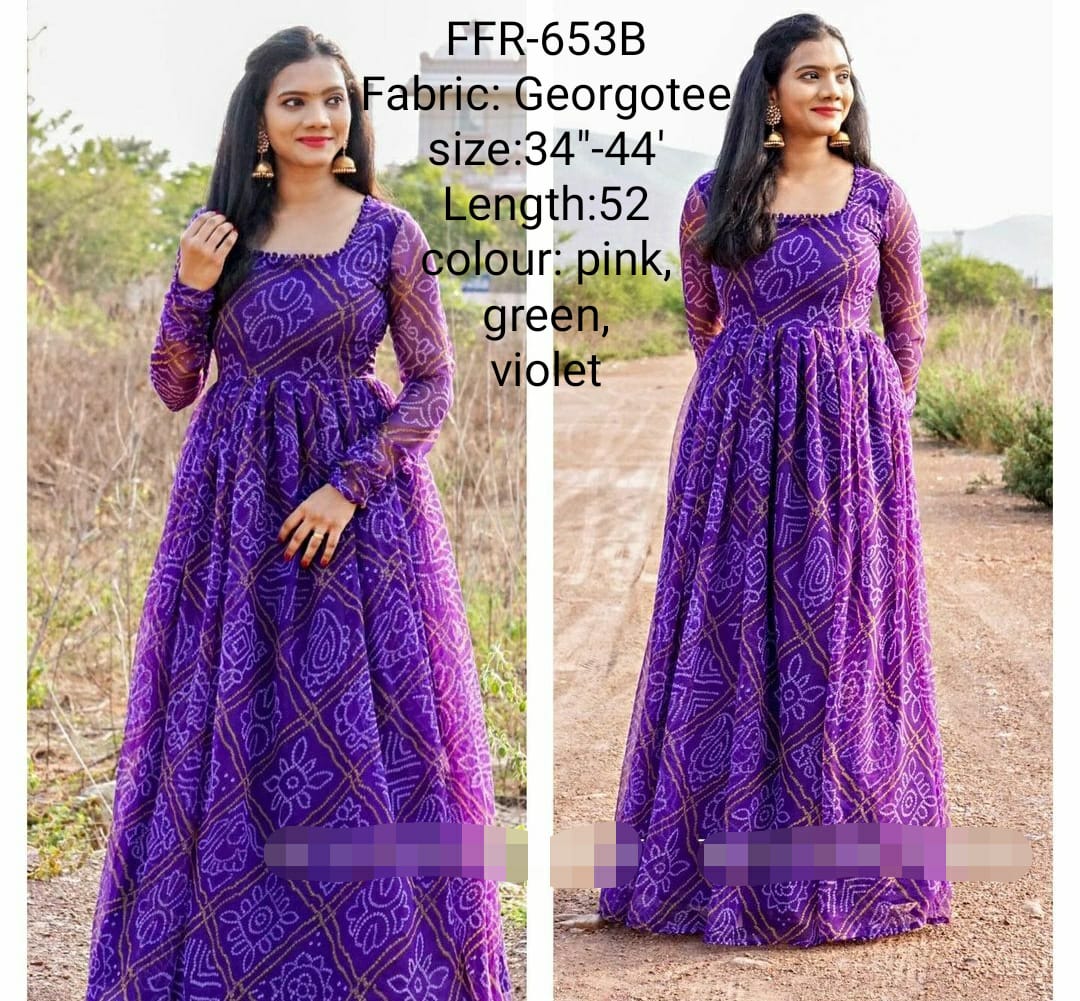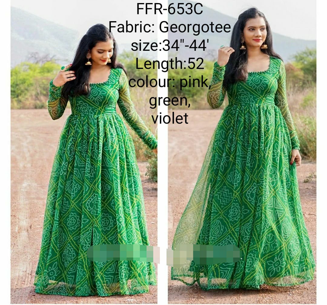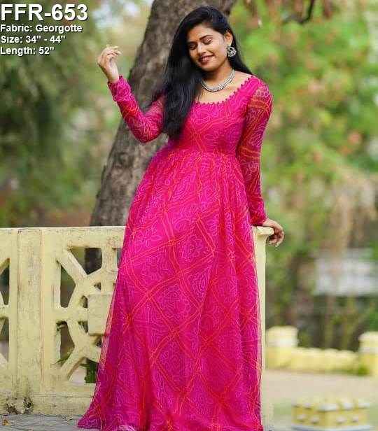 - Customized bandhani printed gorgette longfrock.Sizes:XS S M L XL XXLPlus sizes can also be Customized on extra charge.
