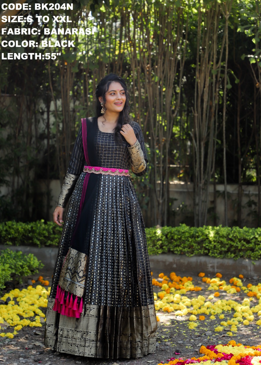 - Benaras pattu longfrock paired with net dupatta along with work hipbelt.Sizes:S M L XL XXL Floor length:55