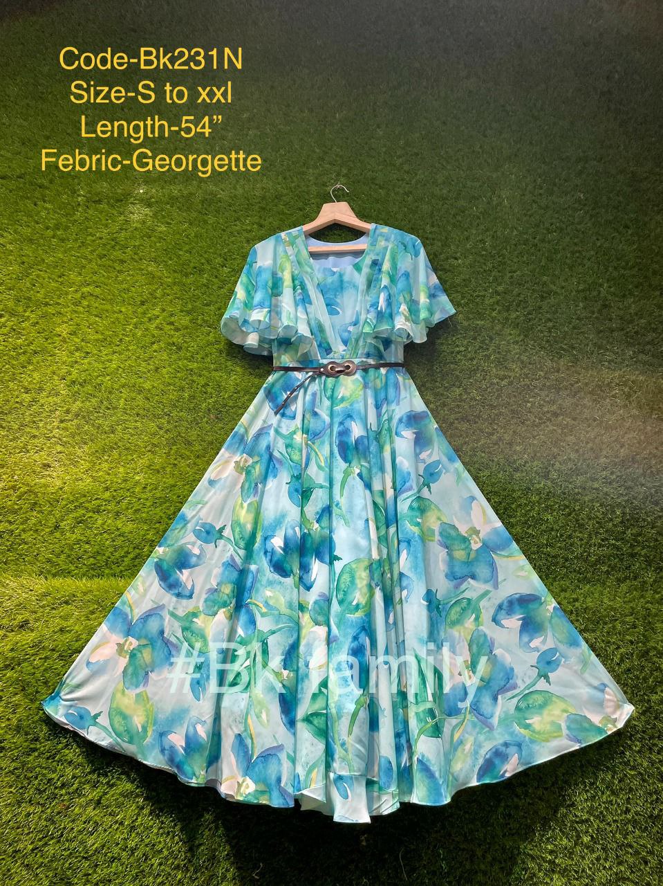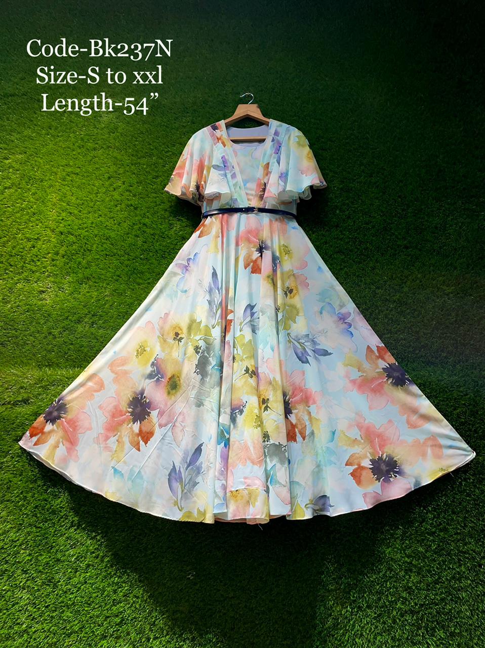 - Floral gorgette longfrock paired with ruffle sleeves.Sizes:S M L XL XXL Floor length-54